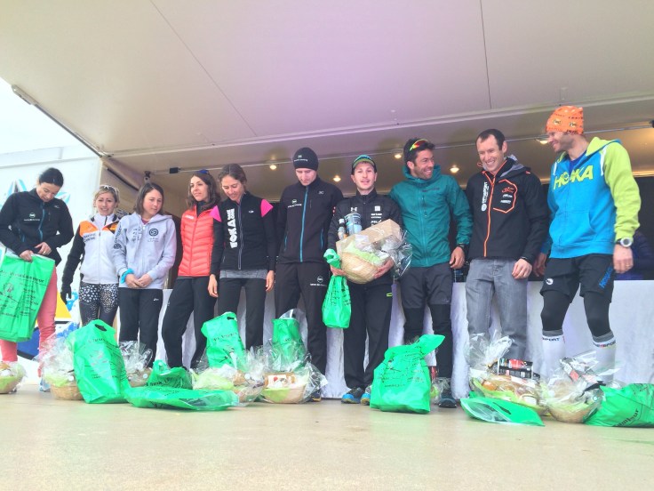 Je passe le 10km en 1h05m, la descente est technique avec beaucoup de caillasses. Je remonte sur un peloton et accélère sur la seconde partie de course : pas de douleurs ni gènes du côté de mon talon. Peu après la bifurcation entre les 2 distances, l’organisation nous réserve une petite surprise : passage à genoux d’un tunnel d’une dizaine de mètres. Je fini avec de bonnes sensations en 1h40m10s à ma montre (1h42m59s en officiel et 650 D+) à la 42eme place. Camille sera appelée sur le podium à plusieurs reprises. Elle indique finalement à l’organisation qu’elle n’a pas couru afin d’appeler ainsi une autre féminine pour compléter le podium.
