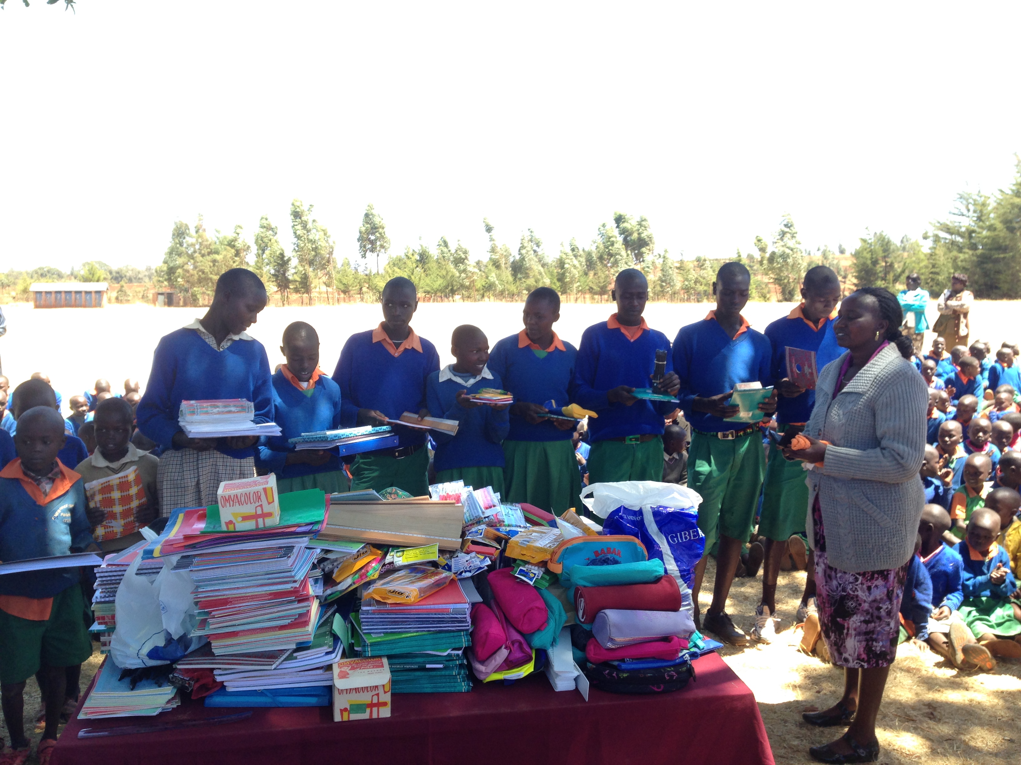 Bob fait venir 5 matatu (minibus), on part faire la visite de l’école primaire de Chebonet. Elle est isolée par rapport à la route et située en périphérie de la ville. Brother Colm préfère que l’on distribue les fournitures à cette école plutôt qu’à la plus médiatique Saint Patrick’s High School qu’il dirige. Nous sommes accueillis par le directeur de l’école ainsi que par des professeurs. Ils regroupent une table, on commence à y positionner l’ensemble des fournitures. Je suis un peu gêné de cette démarche car des chaises ont été positionnées tout autour de la montagne de fournitures. Cela fait un peu le groupe de touriste blanc qui s’installe. Rapidement, les 150 étudiants en bleu et orange se regroupent et commencent à chanter, c’est très émouvant et cela donne la chair de poule. Une des chansons contient dans son refrain les mots Alléluia et Jésus Christ. Dans un second temps, les fournitures sont distribuées aux délégués de chaque classes. On commence ensuite à faire des selfies et à jouer avec les enfants. Certains les photographient avec leurs lunettes de soleil leur donnant un look sympa. Ils doivent avoir entre 6 et 7 ans. Je pars visiter les salles de classe. Certaines sont vraiment spartiates, en terre battue et sans pupitre. D’autres ont des affiches avec la présence de mot en anglais ou de forme mathématiques. On reste environ une heure et demie.