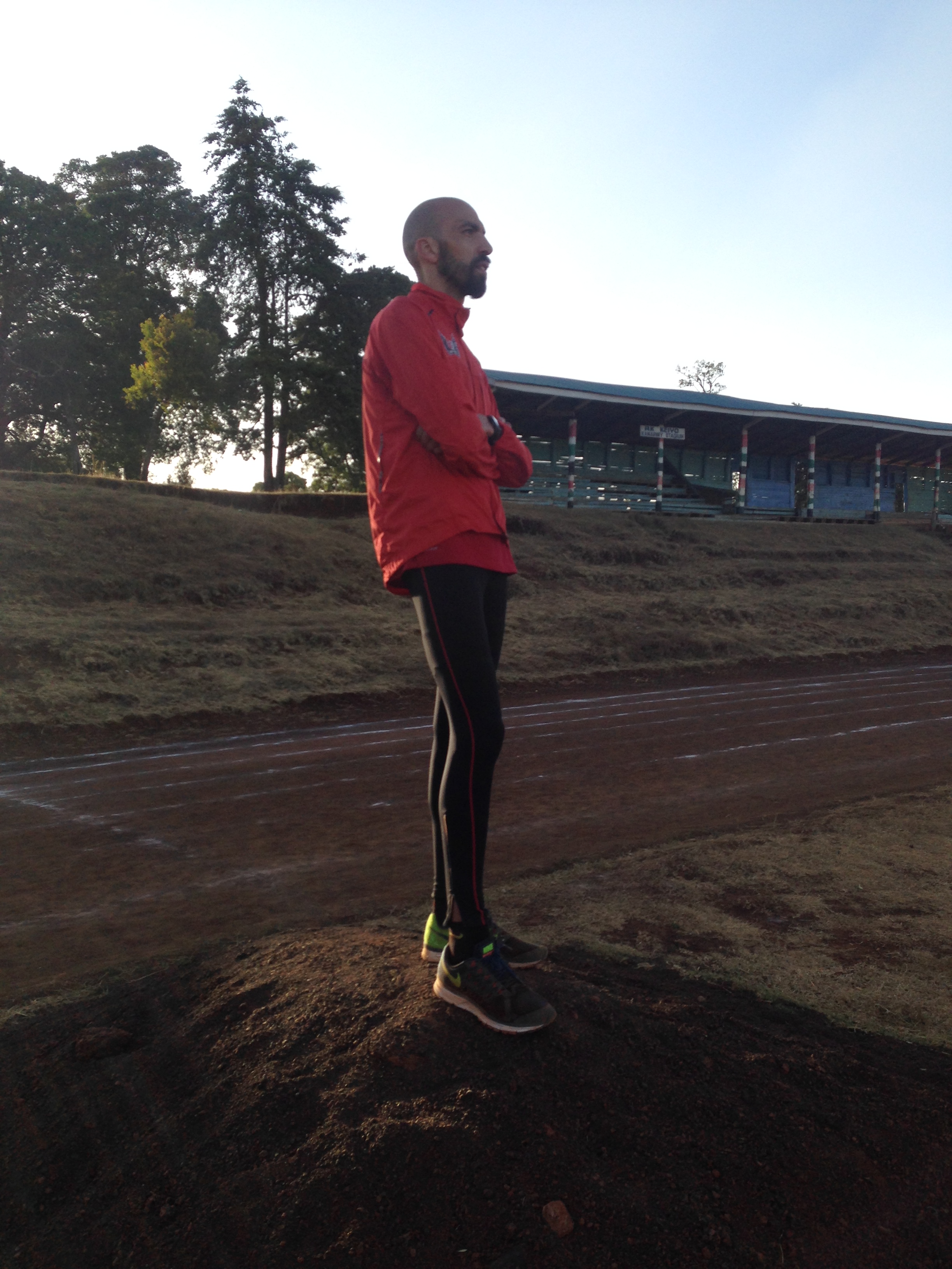 Je ne ressens aucune gêne ni douleur. Je suis super content. Je respecte à la lettre la séance ainsi que les temps de récupération. Je profite au maximum et sens quand même que je manque de rythme et que l’altitude fait monter plus rapidement mon cardio. Après quelques étirements, qui ne ciblent pas mon mollet, je me transforme en reporter photo pour le groupe 1. Je récupère quelques appareils photos et Go Pro et les suit dans leur séance de synchronisation, de coordination et de montées d’escaliers dans les tribunes du stade. Une chose me marque au premier coup d’œil avec les pistards kenyans qui continuent d’enchainer les tours de piste : c’est leur pied. Bob parle de « pied fort » mais ils ont développés naturellement une souplesse dans leur cheville. Ceci peut s’expliquer par les chemins accidentés sur lesquels ils s’entraînent depuis qu’ils sont tout petits. Les pierres, le sable et le dénivelé habituent le pied qui doit s’adapter au terrain. Ils courent la plupart sur la pointe des pieds et avec un temps au sol très faible. Ils sont également très secs avec des mollets et cuisses dessinées et longilignes.