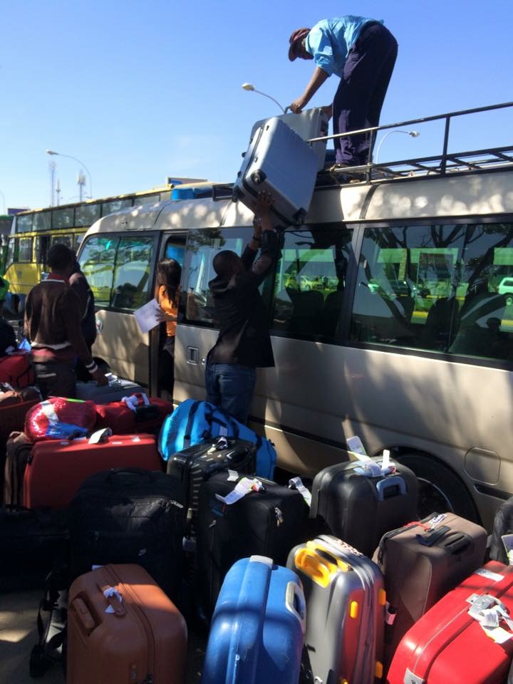 Nous embarquons finalement sur le vol KQO117 de la compagnie Kenyan Airways. Je dors pratiquement tout le vol qui dure 8h20m. Nous remplissons les formalités habituelles de douane avec notamment le visa. Il coûte 40 € ou 50 $. C’est plutôt rapide, j’ai bien fait de ne pas m’occuper de cette formalité à Paris. Le groupe passe un à un, nous nous retrouvons autour du tapis pour récupérer l’ensemble des sacs. J’oublie au passage mon appareil photo au comptoir des visas, heureusement je m’en aperçois assez rapidement, ça allait bien commencer ! Je charge l’ensemble des sacs sur un chariot. Au dernier passage de la douane, Guillaume G et moi ne passons pas inaperçus avec nos caddies chargés de valises. Bien évidemment, on se fait arrêter. On explique que l’on est un groupe. Elle ouvre 2 de mes sacs. Je lui explique que ce sont des vêtements pour une association. Elle commence à m’expliquer que les donations sont règlementées. Je reste calme et elle finit par nous laisser passer mais précise qu’il faudra être vigilant pour les prochaines fois. Jean-Pierre a retrouvé son contact qui l’attendait avec une pancarte indiquant : POP- PAHRI GROUP, j’avoue qu’il fallait lire entre les lignes. On rejoint le groupe qui est positionné devant les 2 bus. La montagne de valises est impressionnante, il va falloir maintenant les monter sur le toit du minibus et surtout jouer à Tetris. On attend bien une heure avant de partir. Avec toutes ses histoires, il est déjà 10h.