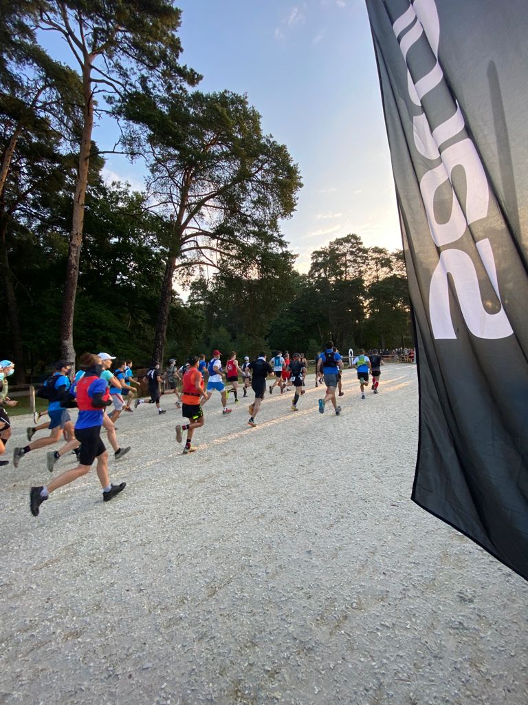 Je pars prudemment en essayant d’être régulier. Le parcours ressemble au paysage des 25 bosses avec des passages dans les sous-bois, dans du sable et à travers les fougères et bruyères. Les premiers kilomètres sont vallonnés. Sans être très raide, les bosses tirent quand même sur les mollets. Un petit groupe se constitue, je le ferme. Le balisage est très visible et je ne veux pas partir en sur régime.
