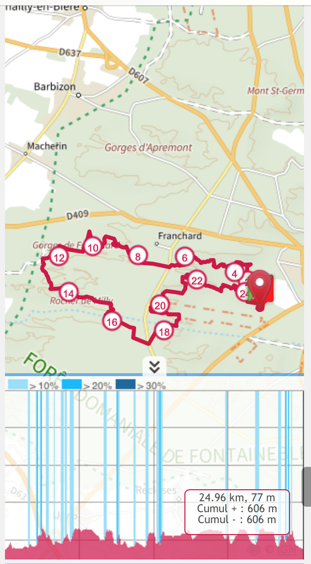 Le parcours est toujours aussi agréable avec beaucoup de variétés sur les paysages. Je fais attention à mes chevilles dans les descentes notamment car les racines et divers cailloux sont très présents.