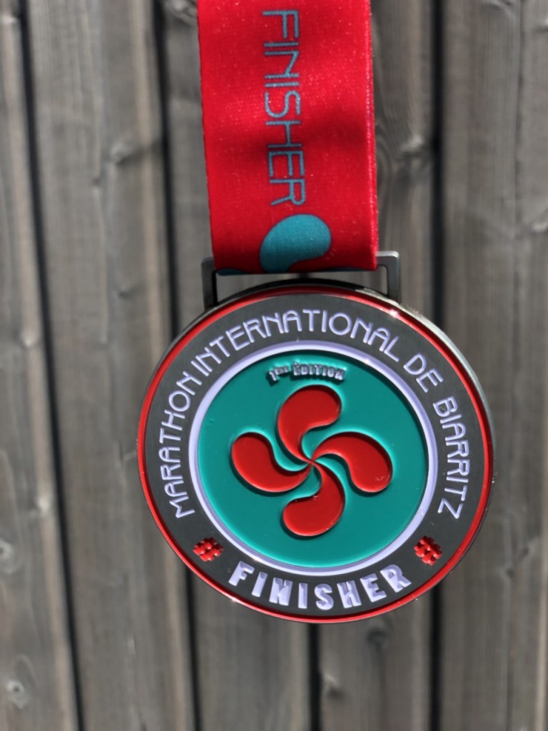 Je fini en pilotage automatique sous les 2h de course jusqu’au stade Aguilera où nous attend une belle médaille avec la célèbre lauburu qui signifie “quatre têtes”. Par contre, pas de distinction de médailles entre les différentes courses. Les ravitaillements sont bien fournies avec une petite bière. Il est tant de vite retrouver mon père qui m’attend au rond point pour le repas dominical.