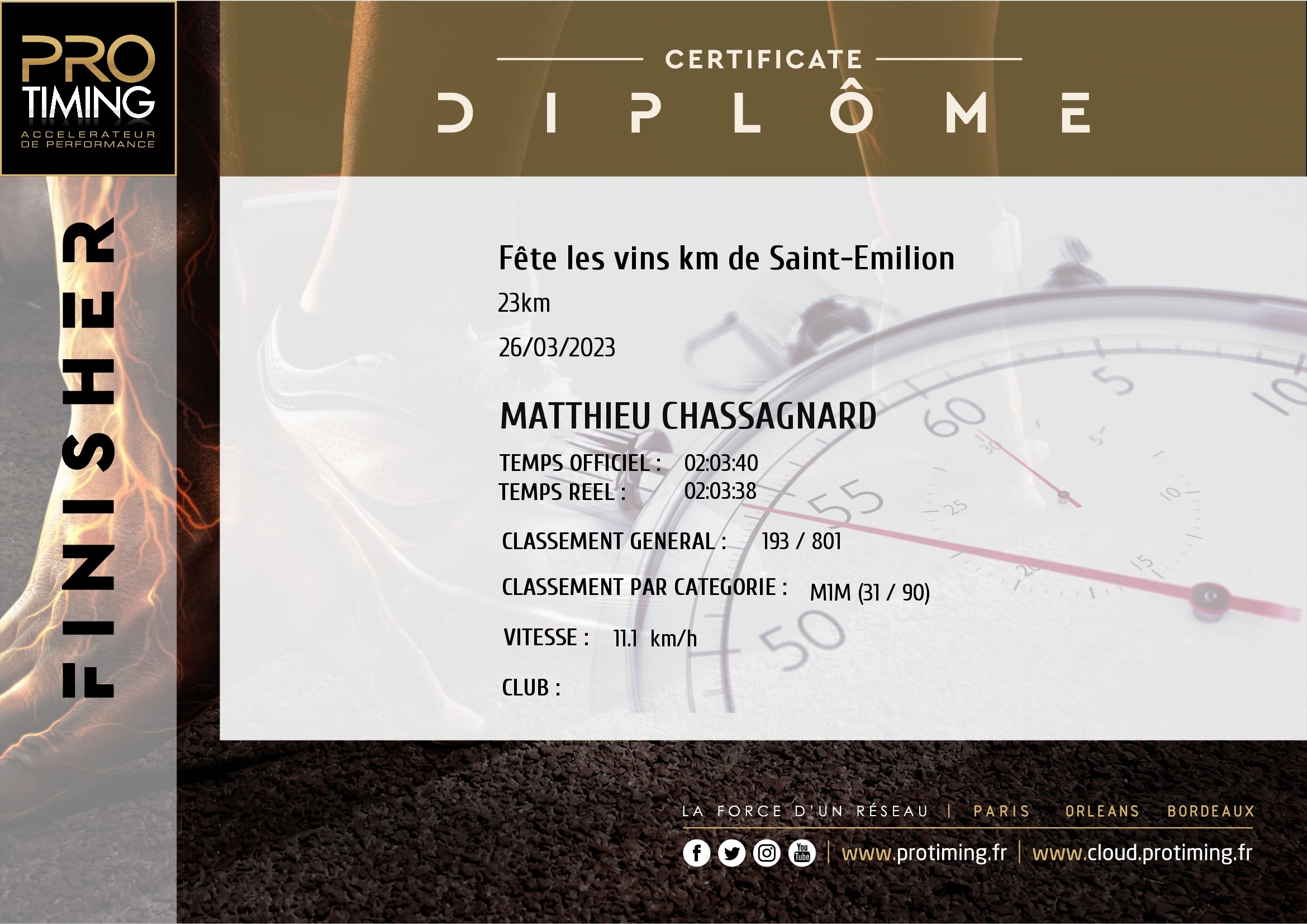 Les 8 derniers kms restent au niveau du parcours les plus sympas à l’approche notamment du retour vers Saint Emilion. Les chemins ont majoritairement remplacés la route surtout vers le Château Pavie. Les derniers kms sont vallonnés mais superbe. Un dernier passage dans un magnifique cloître au centre du village et le retour au Château Soutard annonce la fin de la course au bout de 2h03m38s.