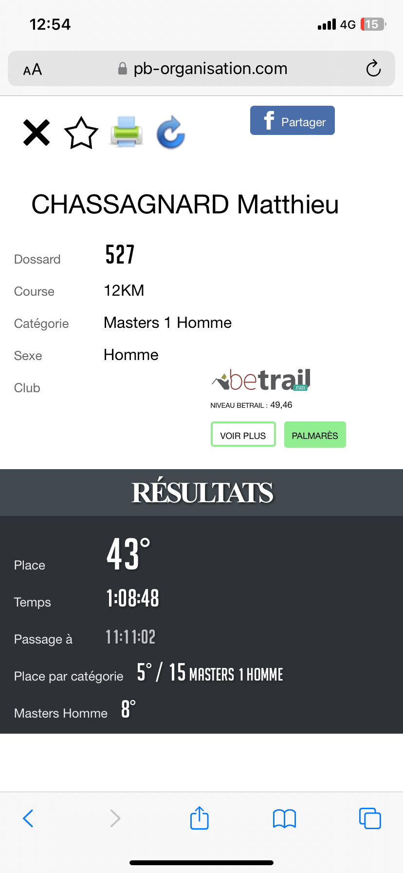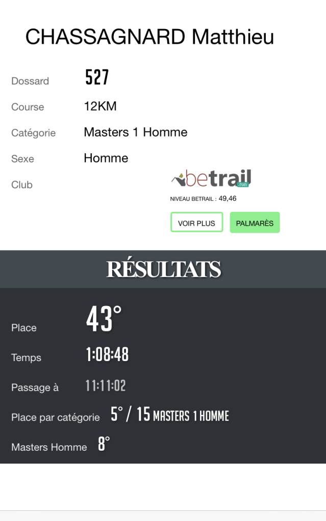 Arrivée en 1h08m48s, plutôt satisfait de ma course surtout après la petite alerte du 4ème km. Paskal fini juste derrière moi à quelques secondes.