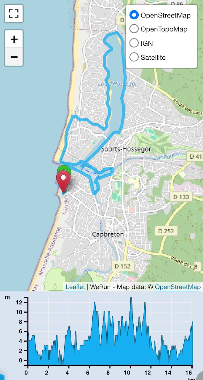 Passage en 46 minutes environ au km 10. J’arrive à rester plutôt régulier pour le moment sauf sur les km10/11 avec ses petites portions de sable. On longe ensuite la plage-Sud d’Hossegor, lieu incontournable qui vaut le détour notamment au moment du coucher du soleil.