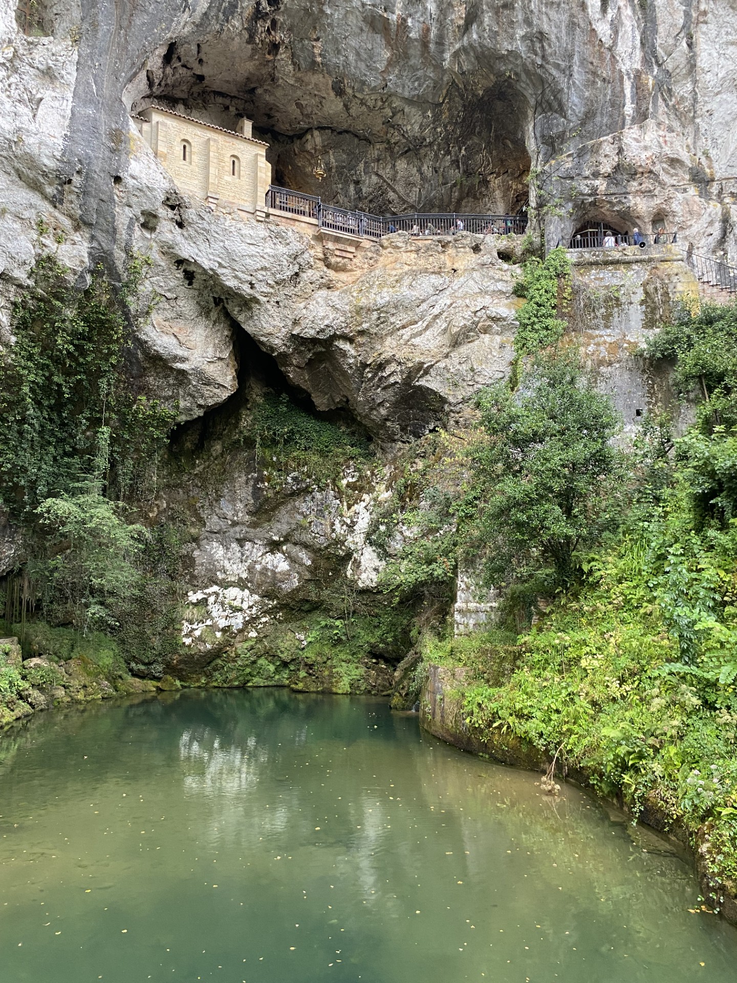 Covadonga vient de l’expression latine « Cova dominica » qui signifie « Grotte de la Dame ». Nous commençons par la grotte de la Vierge, d’où jaillit une source qui forme dans sa chute une lagune dans laquelle les visiteurs doivent accomplir le rite de lancer une pièce. Un autre rite populaire est de boire l’eau de cette source : en effet, « la fille qui y boit, se marie dans l’année »… Nous continuons ensuite la visite de la basilique. Il y a beaucoup de monde, des systèmes de parking relais ont été mis en place avec des navettes.
