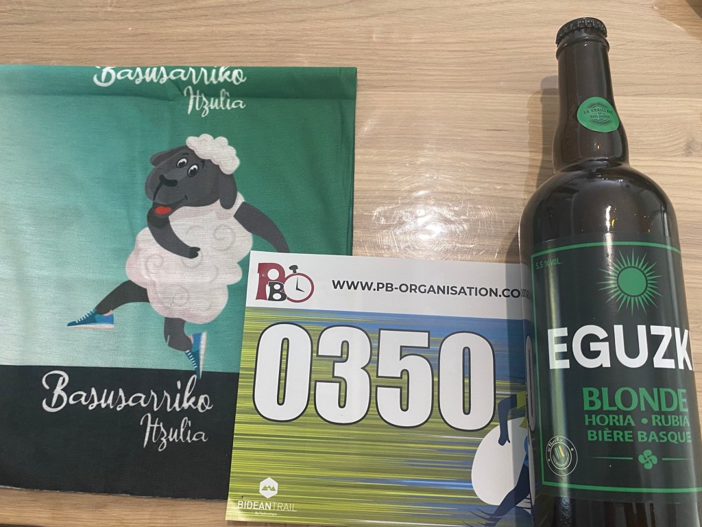 Départ de la maison vers 10h15. La course débute à 11h, pas évident de se garer avec les parkings fermés dans le bourg. Il faut chaud, le thermomètre affiche déjà plus de 25 degrés, il aurait été sympa de nous faire partir un peu plus tôt. Je récupère rapidement mon dossard pendant que la course des enfants débute, avec une bonne cinquantaine de participants. Je pars ensuite faire un AR à la voiture pour y déposer le lot distribué à tous les participants : une bouteille de bière Eguzki et un buff. Sympa cette dotation.