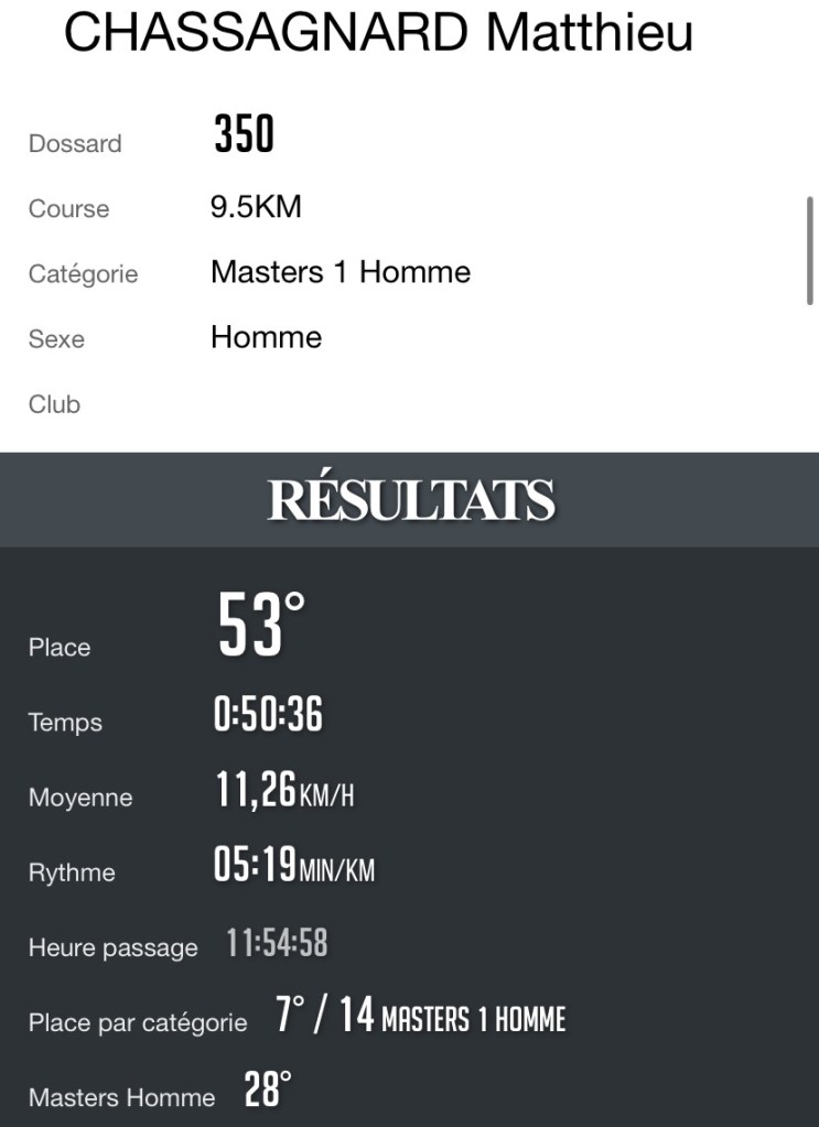 Petite surprise sur une des remontées en sous-bois : une corde nous attend pour nous aider car la pente est bien raide. On rejoint ensuite le vieux bourg avec un passage proche de la médiathèque, terrain de tennis avant de rejoindre l’église et la ligne de départ. Je franchi la ligne en 53eme position avec un chrono de 50’36. Merci à l’organisation et aux bénévoles pour cette belle course.