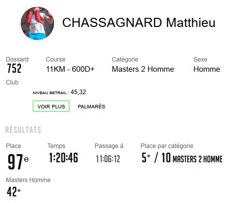 Je termine finalement en 1h20m46s à la 97ème place sur 262 classés. Belle course à faire au moins une fois avec un parcours exigeant. Je trouve ce parcours néanmoins plus accessible que depuis Ascain.