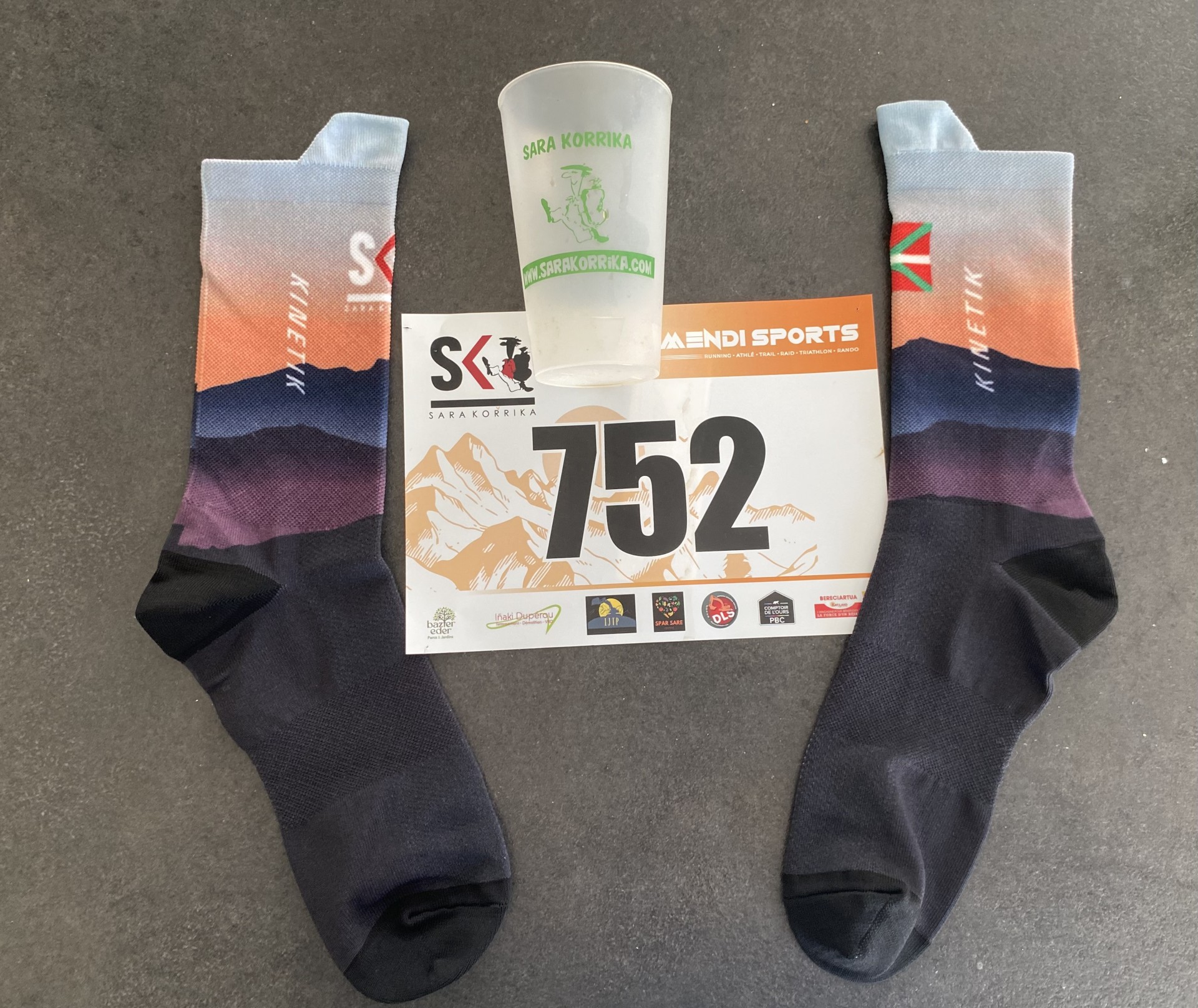 Départ de la maison vers 8h30 sous un ciel azur mais frais, je suis obligé de gratter : mon pare-brise est gelé. Un peu moins de 30 minutes de route. J’arrive à me garer assez facilement pas trop loin du centre ville. Je me mets directement en tenue car le départ est dans moins de 30 min. Je pars récupérer mon dossard et là : refus des bénévoles car ils n’ont pas mon PPS (le nouveau certificat médical en ligne qui reste obligatoire). Heureusement, je l’ai en copie sur mon téléphone laissé dans la voiture. Je pars donc faire un double AR à la voiture en guise d’échauffement et rejoint la ligne de départ pour le briefing de course. En guise de dotation : une paire de chaussette de la marque Kinetik aux couleurs de la Rhune : elles sont très réussies.
